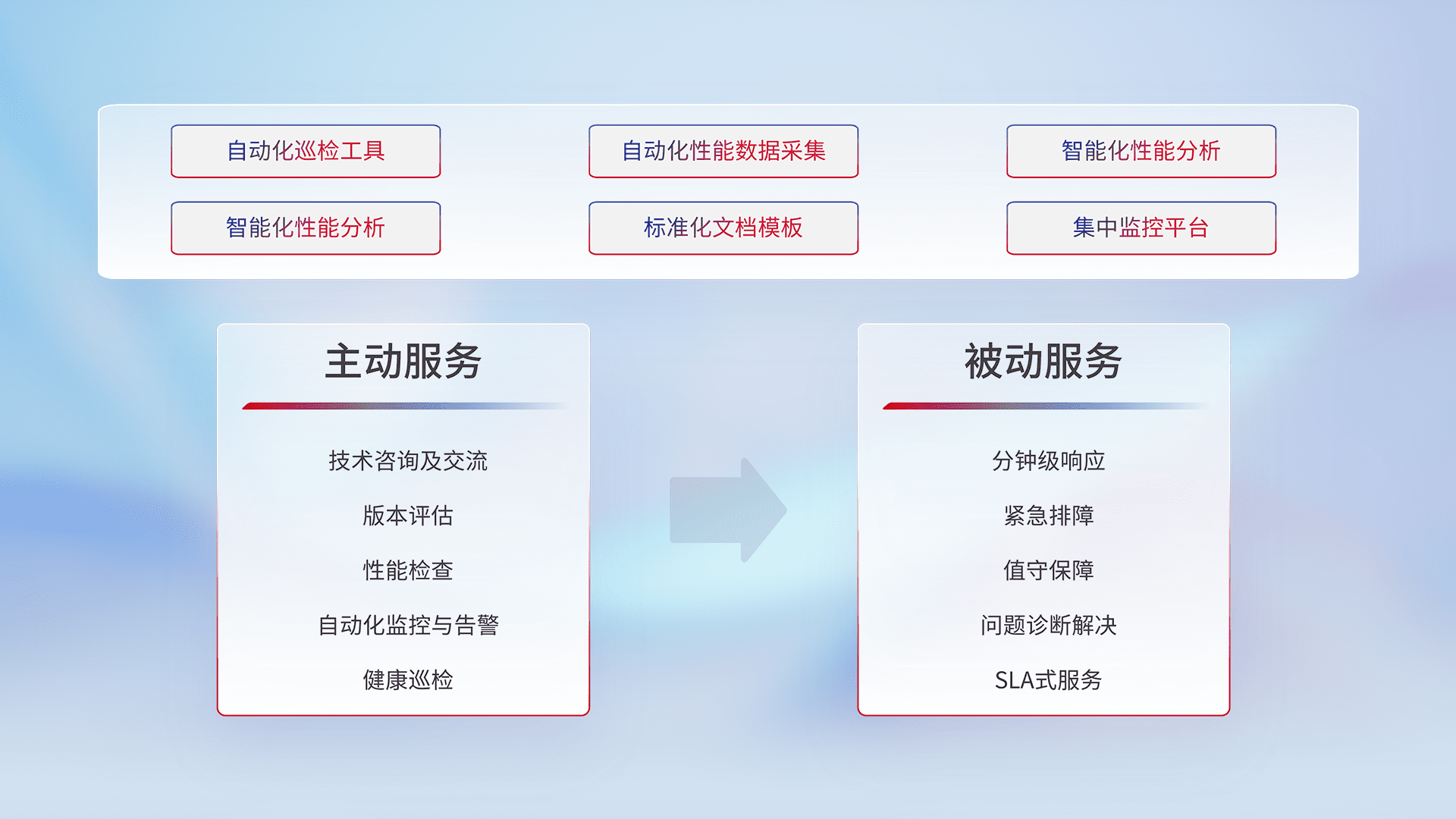 智能化工具和标准化文档,,保障服务质量,,,提供主动服务(包含技术咨询、、、版本评估、、、性能检查、、自动化监控与告警、、、、健康巡检)和被动服务包含(分钟级响应、、、、紧急排障、、、、值守保障、、、问题诊断解决、、SLA服务)。。