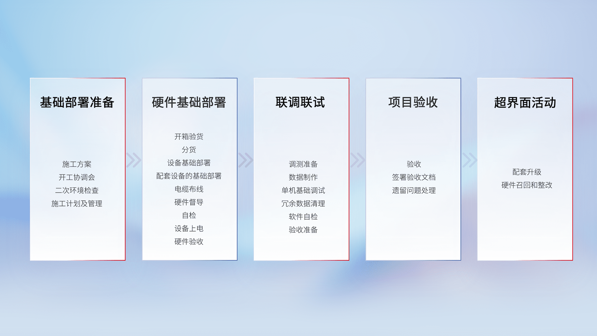 从基础部署准备、、、、硬件基础部署、、联调联试、、、、项目验收、、越界面活动的全过程可追溯,,,,保证施工质量和进度。。